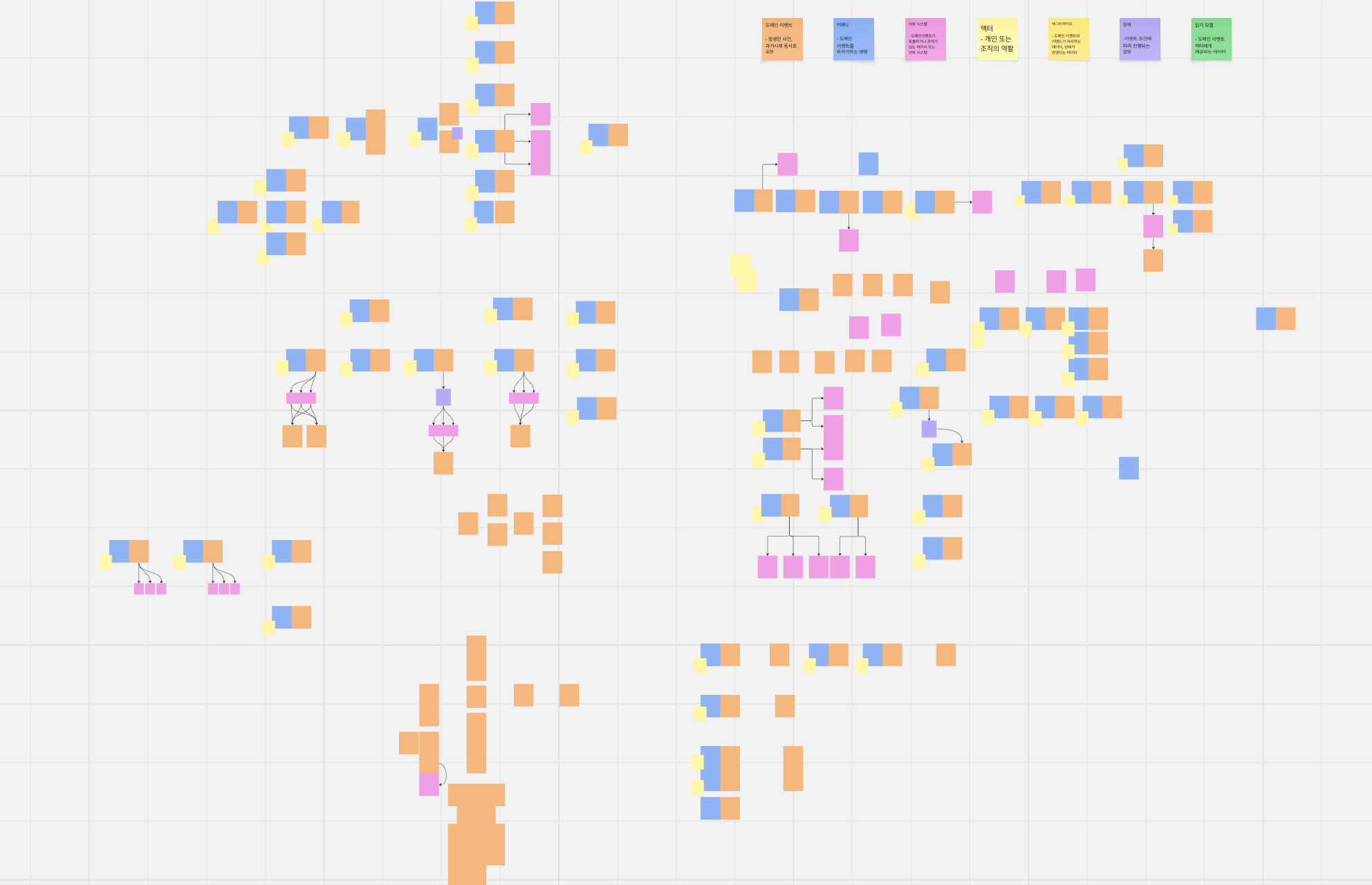 miro 를 사용하여 각자 이벤트 포스트잇을 생성하고 시간순에 따라 정렬하며 액터, 커맨드, 외부시스템, 정책 등을 정해진 규칙(색상, 위치)에 따라 추가했다. 이벤트 까지는 비교적 순조롭게 진행이 되었지만, 외부시스템에 내부의 다른 서버, 외부 솔루션의 어떤 범위까지 포함해야 하는지, 액터에 유저는 기업회원, 일반 회원을 분리할 것인지 여부에 대한 논의가 명확하게 결론지어지지 않았다.