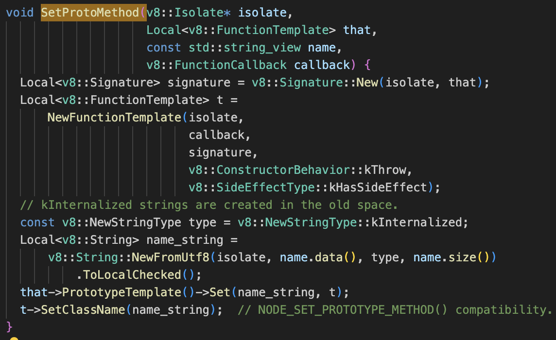 이를 위해 V8의 FunctionTemplate을 사용하여 JS 함수의 설계도(블루프린트)를 만들고, 각 메서드 이름에 대응하는 C++ 콜백 함수를 등록한다. 이렇게 등록된 함수는 JS 코드에서 해당 메서드가 호출될 때 V8이 내부적으로 C++ 콜백을 실행하도록 동작한다.