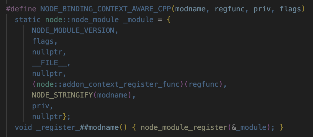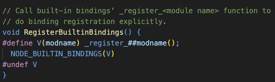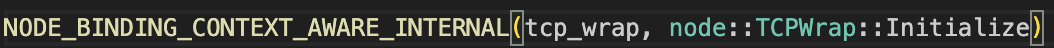 _register_XXX 함수들은 node.js 소스코드가 컴파일 되는 시점에 NODE_BINDING_CONTEXT_AWARE_INTERNAL 매크로가 호출한 NODE_BINDING_CONTEXT_AWARE_CPP 매크로에 의해 생성되어 있는 상태이다. 예를 들어, src에 tcp_wrap.cc가 포함된 상태로 node.js를 컴파일하면 TCP::Initialize 함수의 구현부로 _register_tcp_wrap 함수가 생성되고, 노드가 초기화될 때 이 함수가 실행되게 된다.