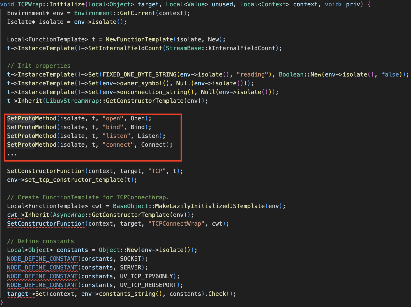 TCPWrap::Initialize함수는 JS에서 호출 가능한 TCP 관련 메서드들을 Node.js의 C++ 구현과 연결한다.