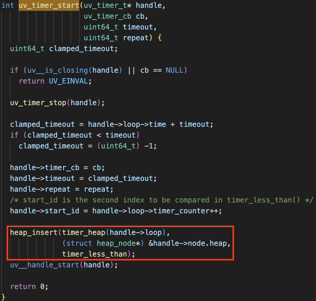 - setTimeout(...) 을 실행하면 uv_timer_start 함수가타이머의 만료 시각(timeout)을 계산해 이벤트 루프 힙에 등록한다.