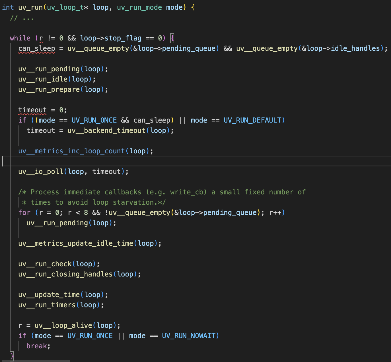 libuv는 uv_run 함수로 이벤트루프를 구현했다. uv_run은 지속적인 I/O 요청을 처리하기 위해서(한개의 I/O 완료 여부를 감시하기 위해서가 아님) 다음의 작업들을 while 루프 내에서 반복한다.
