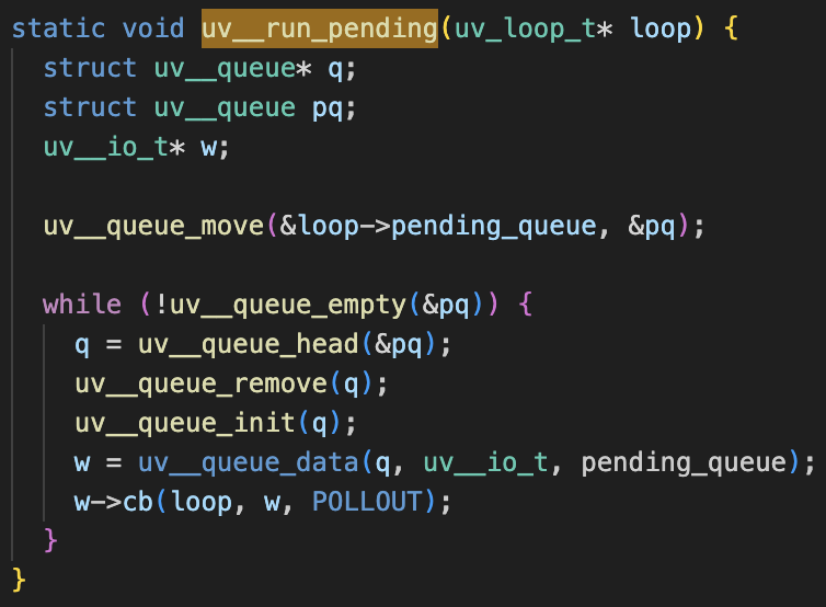 uv__run_pending은 pending_queue 가 empty 할 때 까지 콜백함수를 꺼내 실행