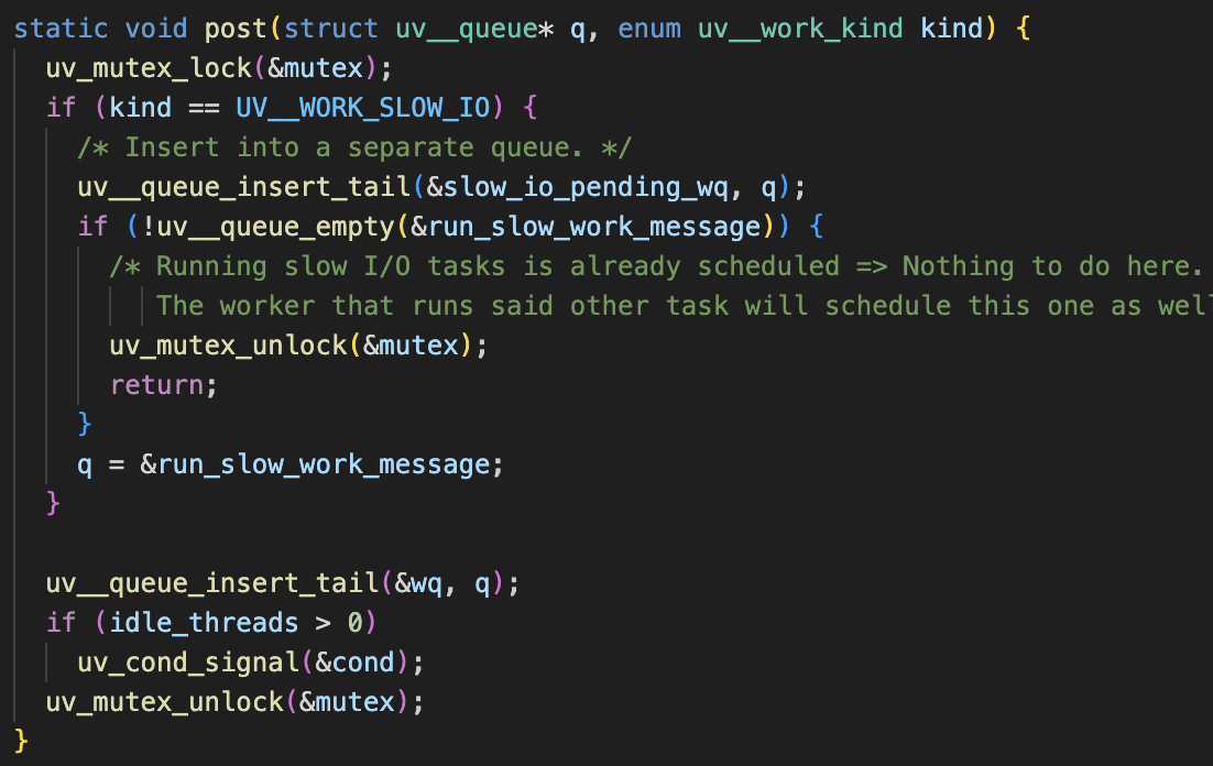 - fs.read(...) 를 호출하면 libuv의 uv_fs_read(이 연결 과정은 이 포스트에 정리해두었다) 가 아래 함수를 호출하여 스레드 풀과 공유되는 큐에 작업을 등록한다. 스레드풀이 큐에서 작업을 꺼내어 처리한 뒤 uv__async_send()를 호출하면 이벤트 루프가 완료된 작업을 pending 큐로 옮긴다.